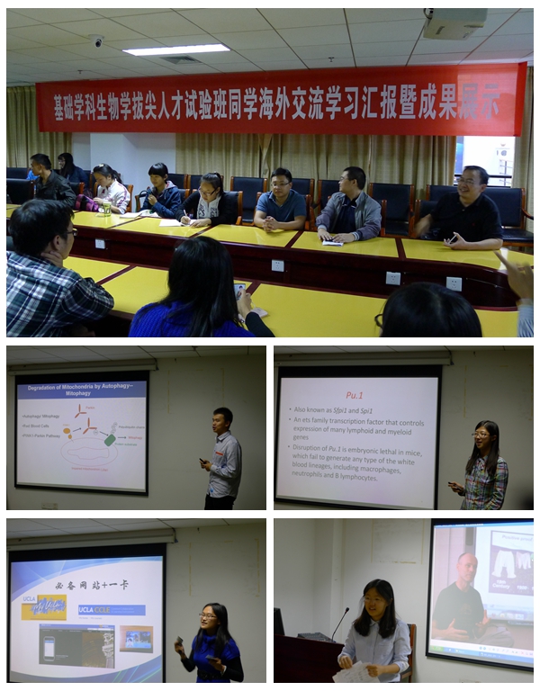 会上,2010级吴昊肸,苟靓珂,黄格,段北璐,以及2011级拔尖班彭芙5位同学分别汇报了他们在新加坡国立大学,美国加州大学洛杉矶分校,美国华盛顿大学,英国伦敦大学,中国香港科技大学交流期间的学习,科研及生活情况,重点介绍了课程学习,导师选择,进入课题组进行科研训练以及海外生活的经验,并展示了他们交流期间学习及科研工作所取得的成绩。最后,赵云副院长做了总结发言,他首先强调了试验班同学“走出去”的重要意义,并鼓励更多的同学能够参与到海外交流学习中来,通过一流大学良好的学习条件和学术环境与氛围,使自己的学习、科研能力与水平得到较大的提升。同时,他还对同学们提出了殷切期望,希望大家在学好课程的同时也要注重提高个人的道德修养和自身综合素质的培养。