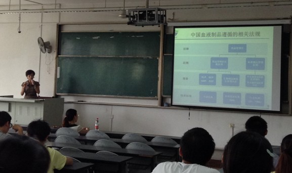 2013年7月2日下午,bat365在线中国官网登录入口国际周课程特邀成都蓉生药业有限责任公司副总经理刘素芳在江安校区为川大学子讲授了我国目前在血液治疗与制品的相关知识,为同学普及了血液治疗的现状以及目前血液制品的生产情况。