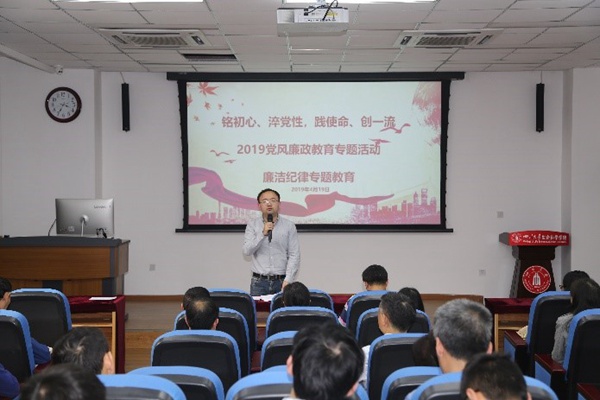 bat365在线中国官网登录入口党委副书记兼纪委书记吴近名同志围绕“党风廉政建设”,从理论与实践相结合的角度讲解了教育系统开展党风廉政建设的重要意义和高校开展党风廉政建设应注意的几方面问题。按照“发挥违纪违法典型案例的警示教育作用,让党员干部受警醒、知敬畏,筑牢思想防线”的精神,列举学校警示大会上传达的发生在身边的腐败案例,提醒教师党员自觉抵制“微腐败”,特别是在科研经费报销、外出考察费用报销等方面要坚守诚信、遵守规范,不断加强师德师风建设。