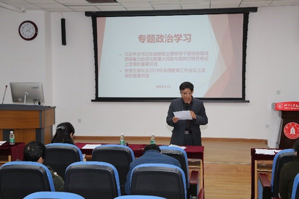 最后,林书记带领大家学习了习近平总书记在省部级主要领导干部坚持底线思维着力防范化解重大风险专题研讨班上的讲话精神和陈宝生部长在2019年全国教育工作会议上作的题为《落实,落实,再落实》的讲话精神。林书记总结到,陈宝生部长的讲话高屋建瓴,立意深远,内涵丰富,思想深刻,既有高度又有力度。学院全体教职工要深入学习贯彻全国教育大会精神,按照“五位一体”总体布局和“四个全面”战略布局,增强“四个意识”,坚定“四个自信”,坚决做到“两个维护”,坚持发展抓公平、改革抓体制、安全抓责任、整体抓质量、保证抓党建,以优异成绩庆祝中华人民共和国成立70周年。