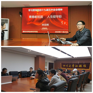 2020年11月26日晚7:30,bat365在线中国官网登录入口党委书记林宏辉围绕“学习贯彻党的十九届五中全会精神”给“江姐班”全体同学讲授了一次别开生面的党课。在本次党课上,林书记就“‘十三五’期间我国取得的主要成就”、“我国发展环境面临的复杂变化”、“到2035年要实现的九个目标”、“‘十四五’期间经济社会发展的主要目标”、“实现奋斗目标的十二方面具体举措”做出了深入的讲解,并强调“江姐班”的学生要以成为未来生物科学领域领军人物而不懈奋斗,青年学子要将个人发展梦想与国家民族前途深度融合,坚定理想信念,用创新书写报国之志,为建设社会主义现代化国家努力奋斗。