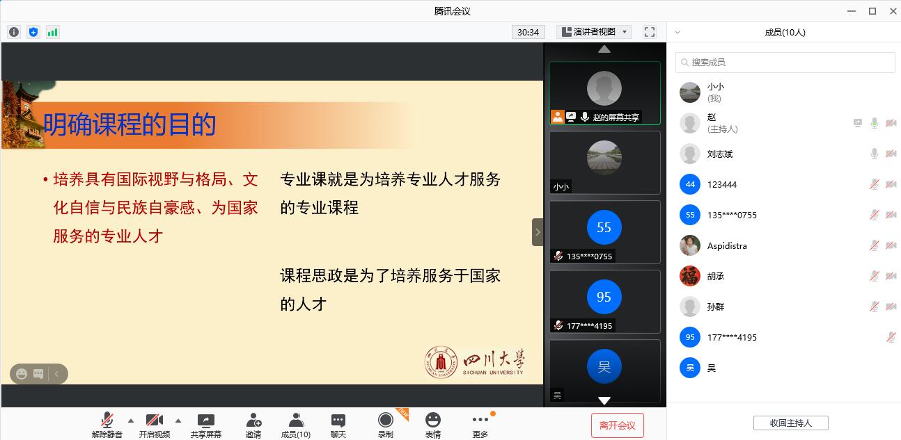 赵建教授首先从课程目的切入,指出要以专业课为主,融入思政教育,培养具有国际视野与格局、文化自信与民族自豪感、为国家服务的专业人才。他以金庸小说为引,分享了在课程中的思政是以用意不用力、润物无声的方式传播内容和思想的自身感悟。赵建教授指出,针对bat365官网自身,应立足生命科学特点,深入课程思政内涵。随后,赵建教授从其所授的《微生物学》、《病毒学》的日常教学内容挖掘,生物专业与当下疫情、实事的思政切入点等详实的展示了自己的思政案例库。他指出要让学生了解专业知识的重要性,主动、有意识地去学习专业知识,再通过思政教育正向引导,将专业知识和正能量结合起来,让学生做科普的传播者。最后,赵建教授与各位参会老师就“如何进行思政课程设计、教学实施?”这一问题进行了深入交流与探讨。