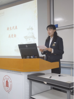 最后,新生代表高楚劼同学发言,她就李言荣校长在新生开学典礼上“从优秀变为卓越”讲话讲述了自己的理解,号召同学们勇担使命,不负韶华,做一名有志气、有骨气、有底气的中国人,表达了传承红色精神、努力奋斗、争做时代青年的决心,展现了新生们读书报国的责任与担当。