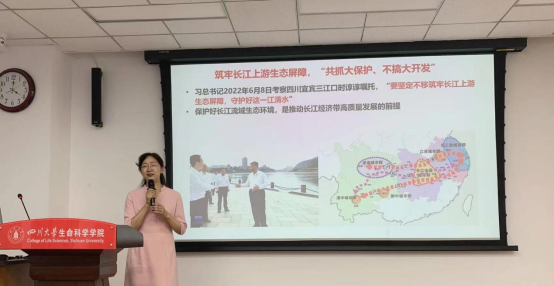王院长结合习近平总书记考察四川时在宜宾三江口时的重要讲话“要坚定不移筑牢长江上游生态屏障,守护好这一江清水”,结合学院开展的生态保护工作进行了阐释。在十四五期间,学院将聚焦保护好长江流域生态环境,推动长江经济带高质量发展,筑牢长江上游生态屏障,开展科研攻关和科学研究。发挥学院专业和人才优势,为双碳目标实现的生态解决方案和长江中上游保护作出贡献。