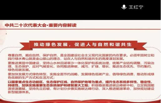 王院长首先带领同学们学习了党的二十大报告的会议的主要内容,重点解读了党过去五年内取得的成就和新时代新征程中国共产党的使命任务,深入剖析了实施科教兴国战略,强化现代建设人才支撑;推动绿色发展,促进人与自然和谐共生两个方面的内容。新时代的十年来,党和国家事业取得历史性成就、发生历史性变革,推动我国迈上全面建设社会主义现代化国家新征程。