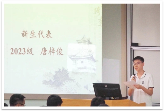 新生代表为2023级唐梓俊,作为今年直接录取到学院的生物奥林匹克大赛全国金奖获得者之一,他讲述了两年前与何兴金教授的相遇相识,并从此开始了解川大,最终受到何教授的鼓励,选择来川大生科院学习的经历,表达了对学校学院的高度认同。他号召同学们要不断求知,创新,树立坚定的理想信念,培养勇担时代重任的良好品质,奋发有为,成为新一代川大人的标签和中华民族的模范。