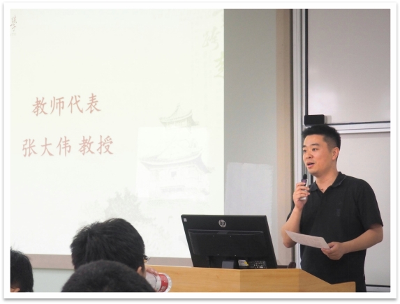 教师代表、学院分管本科教学的副院长张大伟对2023级新生们表示了热烈的欢迎,并结合自身经历向同学们提供了宝贵的发展建议。张院长嘱咐同学们,进入大学后首先便是要敢想敢干,立下凌云之志,坚毅前行;其次便是要有自律的精神,滴水穿石,持之以恒,一日三省;最后便是注重品格的塑造,培养正确的价值观和道德情操,直达自己的辉煌人生之彼岸。