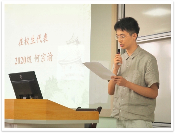 在校生代表是2020级拔尖班班长何宗谕,该同学已经获得了北京大学的研究生预录取资格,他分享了自己在校期间的成长与感悟,鼓励学弟学妹们要探索自身更多的可能性,在埋头努力的同时也不要忘了欣赏沿途的风景,希望同学们最终都可以塑造出一个个独特而充实的灵魂。