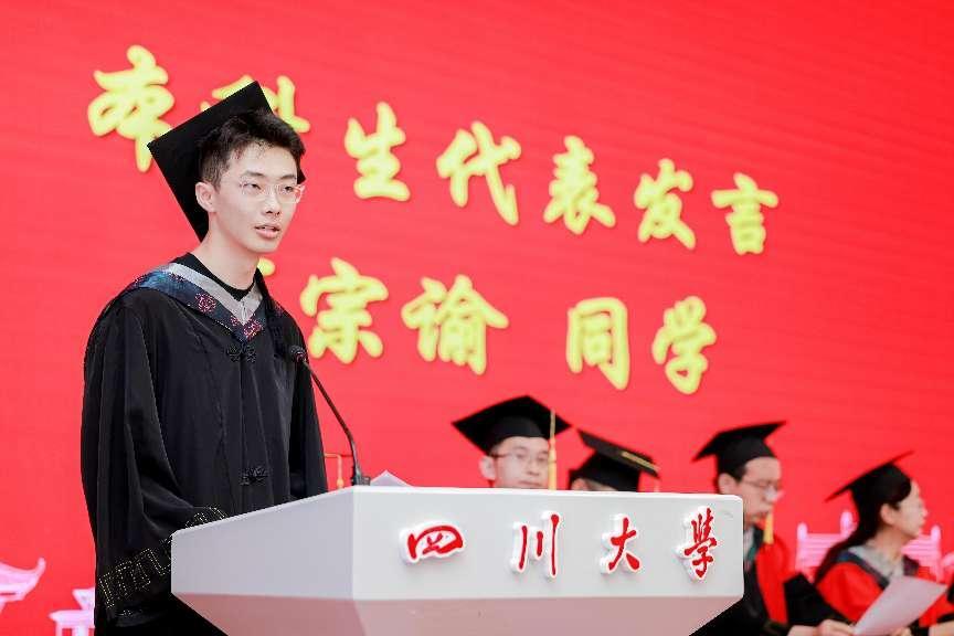 本科毕业生代表,四川省优秀毕业生、拔尖班班长、2024届何宗谕同学发言,表达了自己对母校、学院、老师和同学的深情感谢,与在场师生分享了大学四年逐梦川大的日子,本科四年在每个人心中留下了一段段难忘的回忆,也赋予了每个人继续前进的能力和勇气。他说,我们将从这里向远方再度出发,带着更加丰富的行囊,奔赴人生的下一场山海。