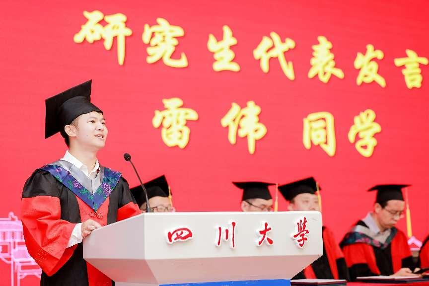 研究生代表,四川省优秀毕业生、bat365在线中国官网登录入口“十佳”研究生、四川省青联副主席,雷伟同学发言。他呼吁同学们一同做出承诺:与时俱进,把终身学习作为自己的人生态度;勇担使命,在岗位上全力以赴、建功立业;会饮水思源,铭记母校恩情于心、报答母校于行。