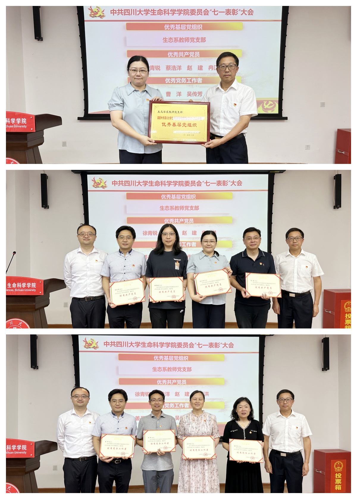 生态系教师党支部荣获“优秀基层党支部”称号,徐青锐、蔡浩洋、赵建和冉江洪同志荣获“优秀共产党员”称号,姜丹蓉、曹洋、吴传芳和杨军同志荣获“优秀共产党员”称号,学院党委领导对获奖的集体和个人表示祝贺并颁发了荣誉证书。