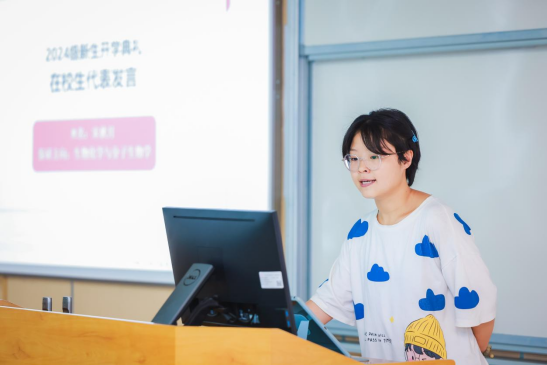 2021级江姐班宋秋月作为在校生代表欢迎同学们的到来,她从学姐的角度向大家展示了精彩纷呈的校园生活,建议学弟学妹们要在探索自身更多可能性的同时找到最适合自己的选择。结合自己的成长经历,她分享了自己在学习和科研上的体会和收获,鼓励学弟学妹们认真学习,稳扎基础,主动探索,尝试用知识解决现实问题,找到自己的学术志趣。最后,她强调了心理健康的重要性,强调学会平衡心态,悦纳不足,在生活、学习、工作中找到适合的应对方式。
