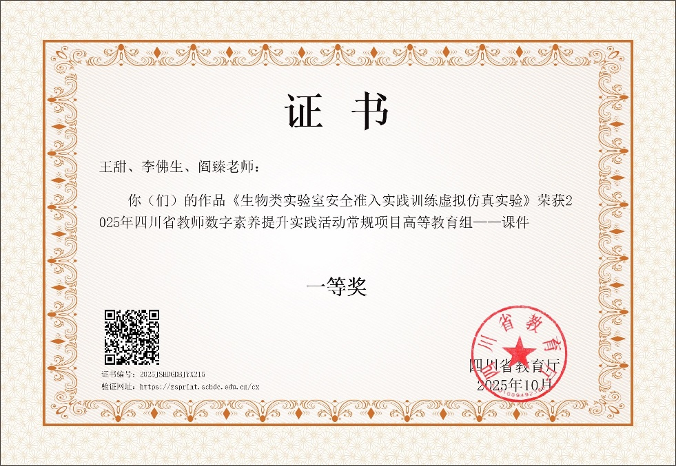 近日,由bat365官网王甜、李佛生、阎臻三位教师申报的常规项目作品“生物类实验室安全准入实践训练虚拟仿真实验”,在2025年四川省教师数字素养提升实践活动中脱颖而出,荣获一等奖。该活动由四川省教育厅主办,依据《四川省教育厅关于举办2025年四川省教师数字素养提升实践活动的通知》部署,旨在强化教师队伍数字素养培育,推进课程改革深化,促进信息技术与教育教学深度融合创新。