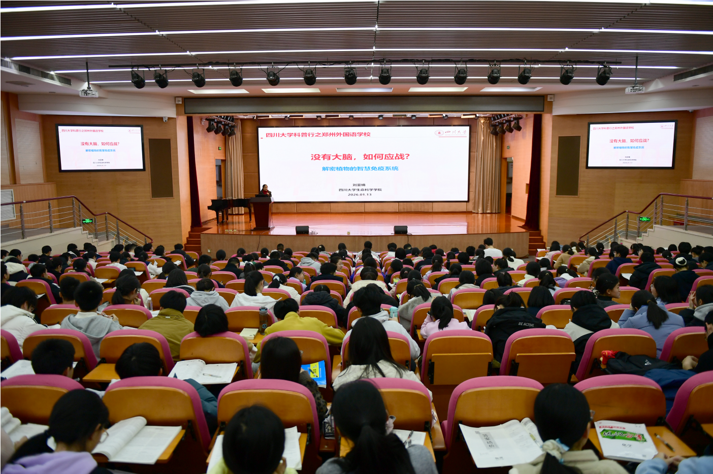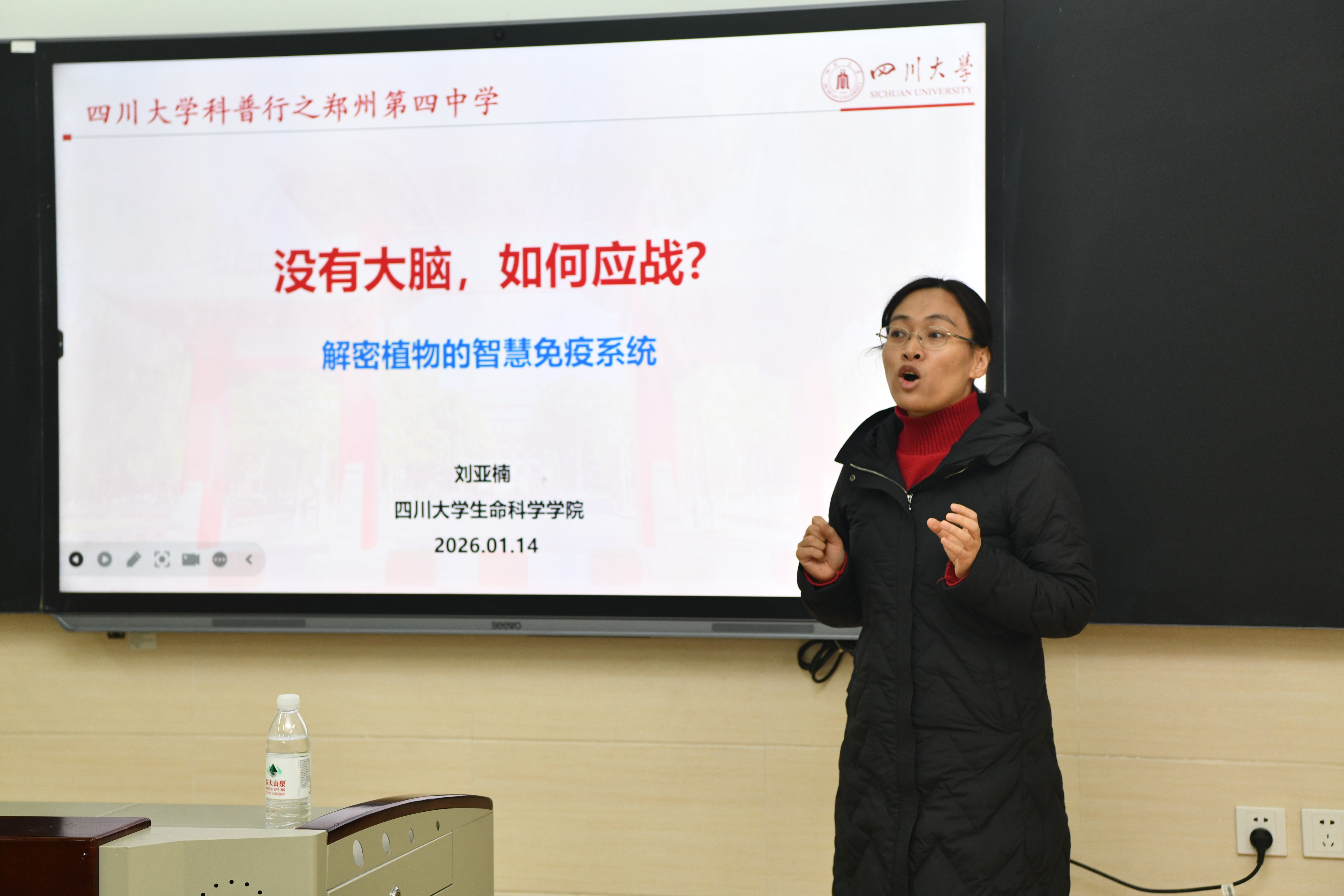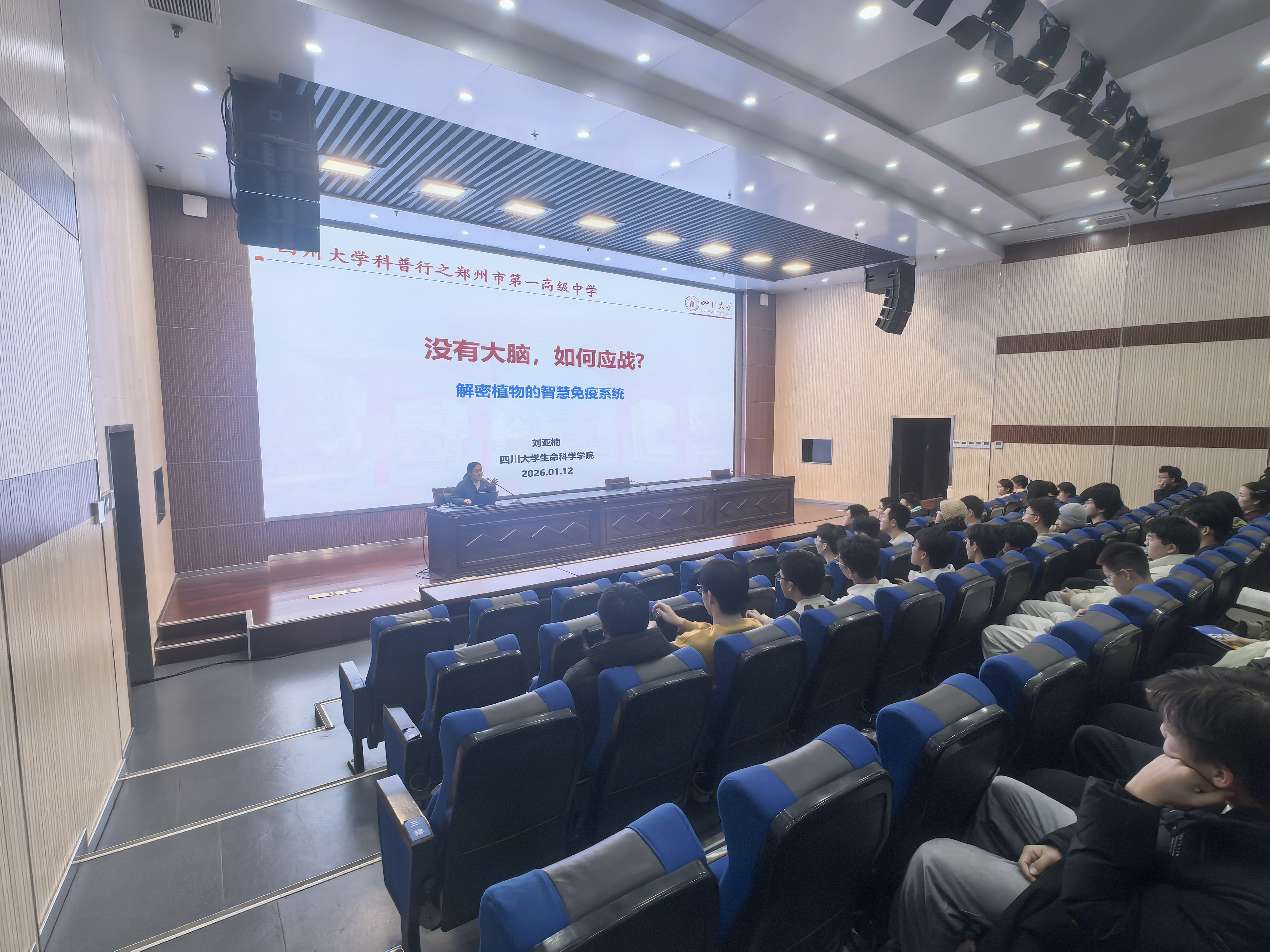 与此同时,生物科学系刘亚楠老师赴河南郑州开展科普宣讲,先后走进郑州市第一高级中学、郑州外国语学校、郑州市第四高级中学、郑州市第七高级中学这四所重点中学,为近千名高中学子献上了一场场生动有趣的植物研究科普盛宴。她以自身科研积淀为基础,将植物的智慧免疫系统喻为“静默情报网”,生动阐释了“哨兵受体”识别入侵、“抗病蛋白”启动细胞程序性死亡、化学信号远程激活系统抗性等微观防御机制。这场讲座不仅揭示了植物“无脑抗疫”的生命智慧,更引导学生触摸到“培育抗病作物、发展绿色农业”的前沿科研脉络。在系统介bat365在线中国官网登录入口优势的同时,她着重分析了“选择川大”背后的战略视野:成都作为“成渝地区双城经济圈”的核心,正肩负着打造国家经济增长“第四极”和“战略大后方”的时代使命。选择位于成都的bat365在线中国官网登录入口,意味着选择与一座充满活力与机遇的未来之城共同成长,将在国家重大战略布局中赢得更广阔的发展平台。她建议同学们将个人理想融入时代潮流,科学规划学业与未来。