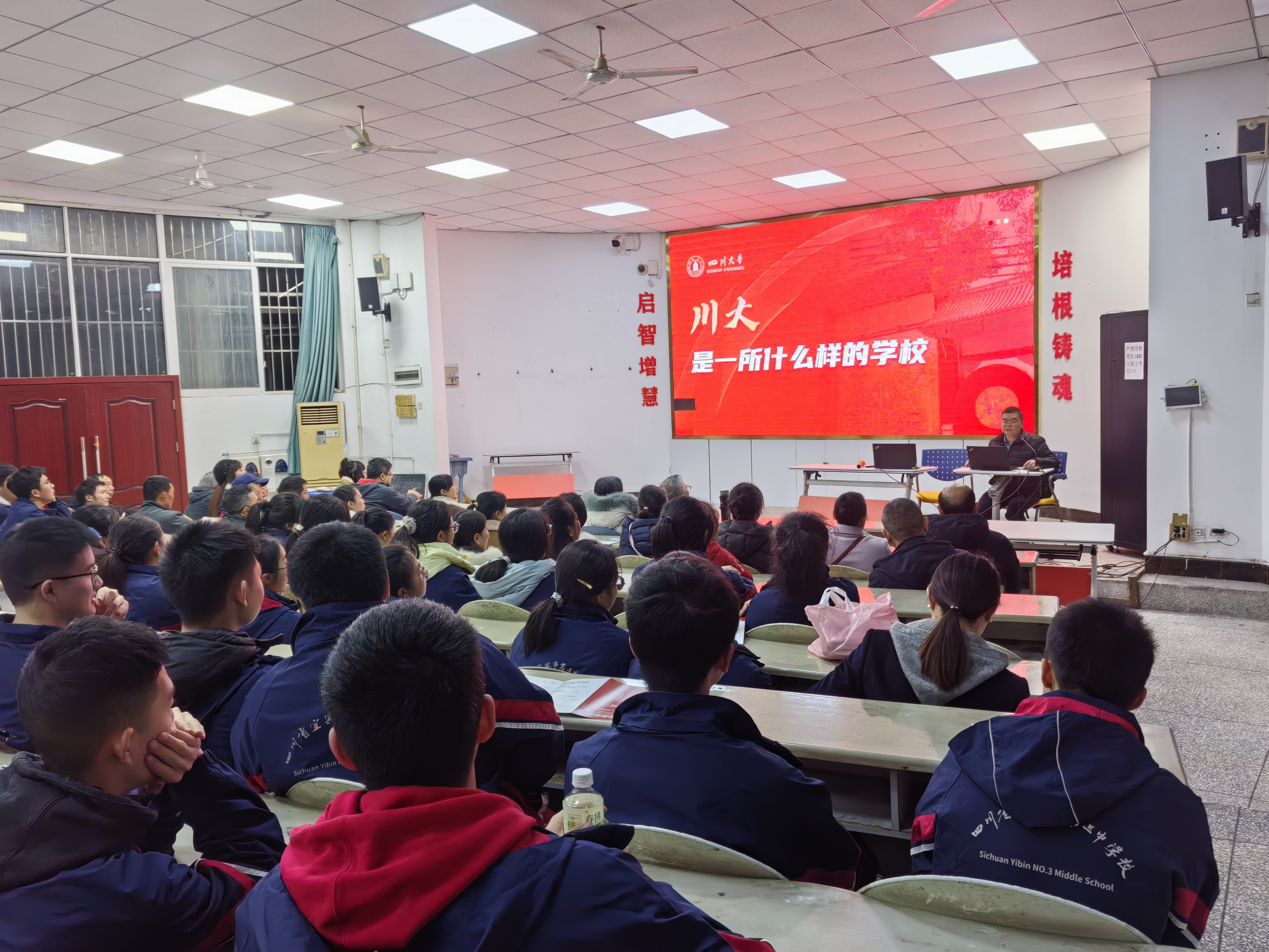 在宜宾一中、宜宾三中,生物科学系张年辉老师为500余名高中生带去了题为“在川大,成为更好的自己”的专题宣讲。张老师从自身在川大多年的学习、教学与人才培养经验出发,深入浅出地阐释了一所“好大学”的真正内涵。他指出,川大之“好”,不仅在于其厚重的历史底蕴、齐全的学科门类和先进的硬件设施,更在于其“海纳百川”的学术氛围与“求真务实”的文化内核。在这里,学生既能接触到致力于解决国家重大需求与科学前沿“真问题”的师长,获得扎实的学术训练与创新引导;也能在综合性大学多元、开放、包容的环境中,真正根据自身的兴趣与特长自主探索、全面发展。张老师还特别分享了指导学生参与国际遗传工程机器大赛(iGEM)并斩获金奖、跻身全球前十的宝贵经历,强调这类顶尖的科研实践平台,正是优秀大学能赋予学生的宝贵成长机会。他鼓励同学们从现在起就坚定目标、勤奋学习,用今天的拼搏,亲手为自己赢得在川大这样广阔的舞台上探索、挑战与成长的精彩未来。
