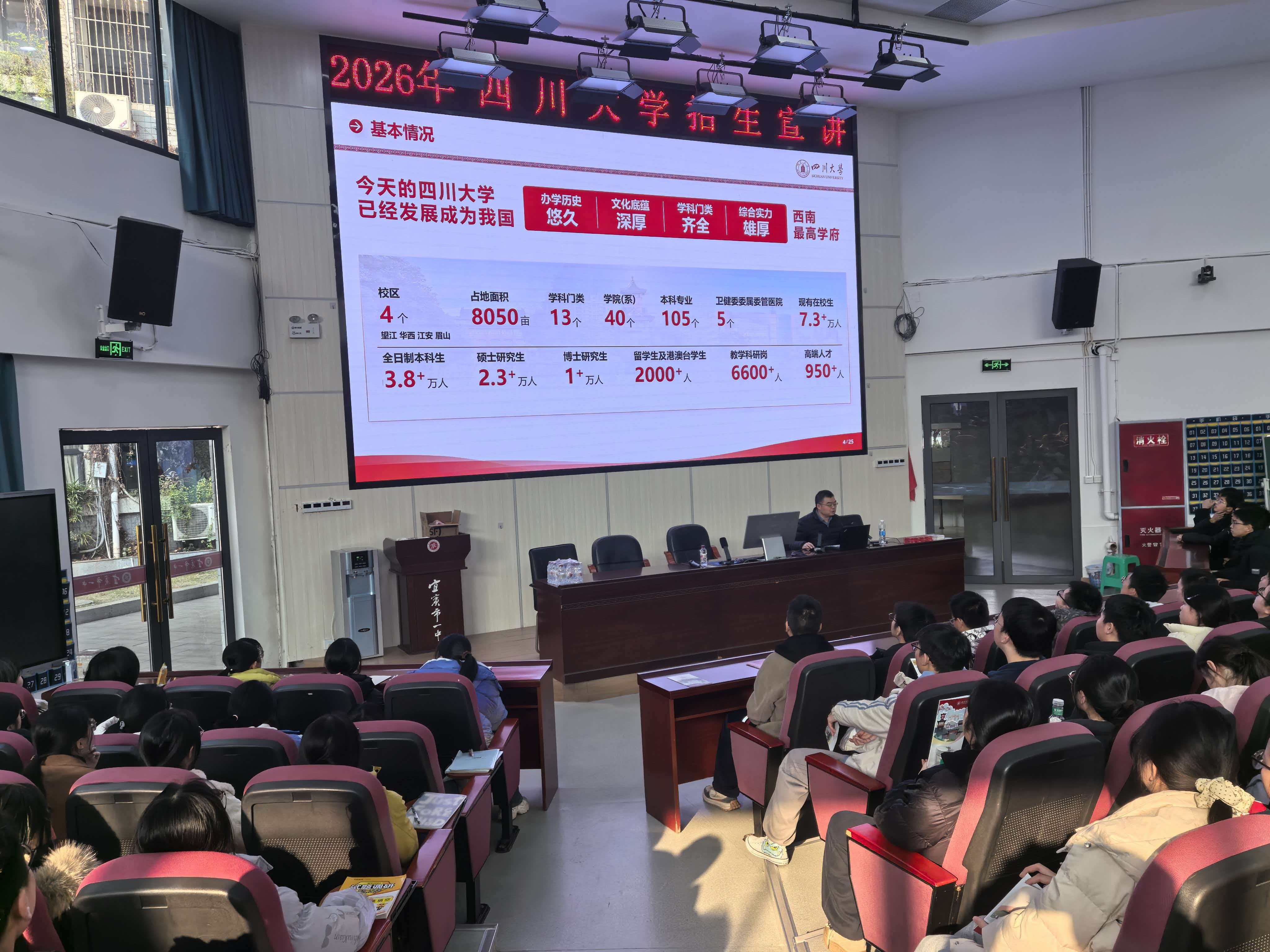2026年1月12日至15日,bat365在线中国官网登录入口积极响应学校招生工作部署,组织教师分别前往河南省郑州市和四川省宜宾市的多所重点中学,开展了一系列富有深度的招生宣讲与学科科普活动。此次活动不仅为两地学子带来了权威的政策解读,更通过生动的讲述与互动,展现了川大作为一所综合性研究型大学的独特魅力与育人实力。