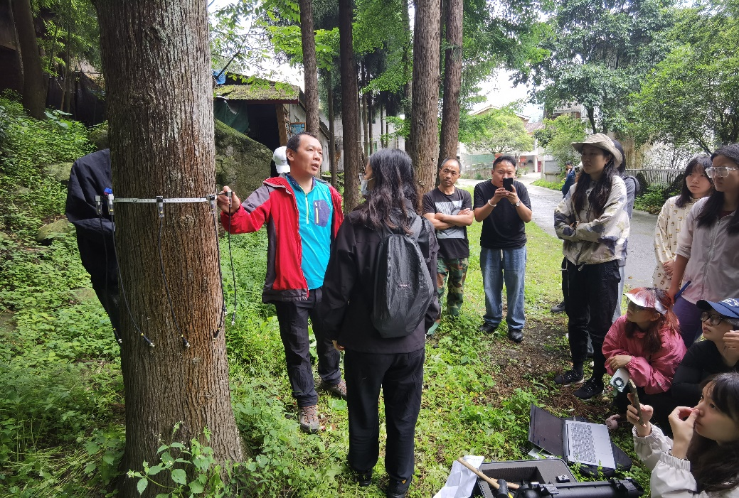 实习任务包含典型人工林样地调查和林业技术操作规范(标准样地调查、生长锥、PiCUS3树干横断面声波检测仪学习、无人机学习等)。四川省林业科学研究院冯秋红研究员为同学们详细讲解了人工林标准样地资源调查的理论与操作流程。张胜教授讲解并演示了生长锥、树干横断面声波检测仪的使用方法和森林土壤剖面特征。