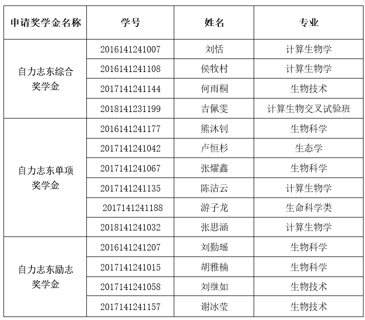 根据评审办法,经学生个人申请,年级推荐,学院初审,学生答辩,评审小组评定,评出“自力志东综合奖学金”4名,“自力志东单项奖学金”6名,“自力志东励志奖学金”4名,现进行公示。