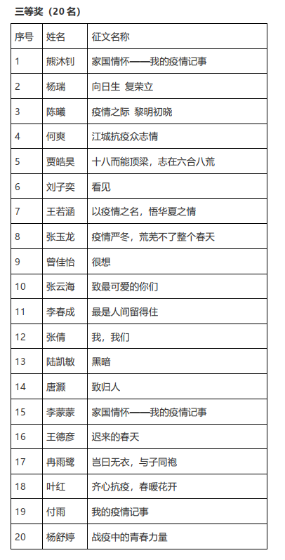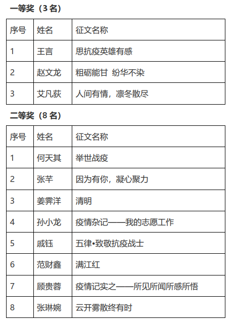征文活动自4月26日开展以来,共收到投稿65篇。经严格评审,王言同学的《思抗疫英雄有感》等3篇征文获一等奖,何天其同学的《举世战疫》等8篇征文获二等奖,熊沐钊同学的《家国情怀——我的疫情记事》等20篇征文获三等奖,张琳婉同学的《云开雾散终有时》等34篇征文获鼓励奖,2017级生物技术专业团支部等7个集体获优秀组织奖。获奖名单详见附件。
