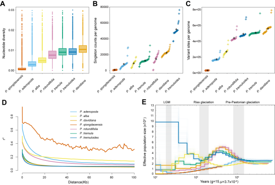 研究人员首先通过构建系统发育树,主成分分析以及群体遗传结构检验,确定了七个物种间的遗传进化关系。不同物种间遗传多态性,连锁不平衡和群体历史动态等均存在较大差异(图2)。