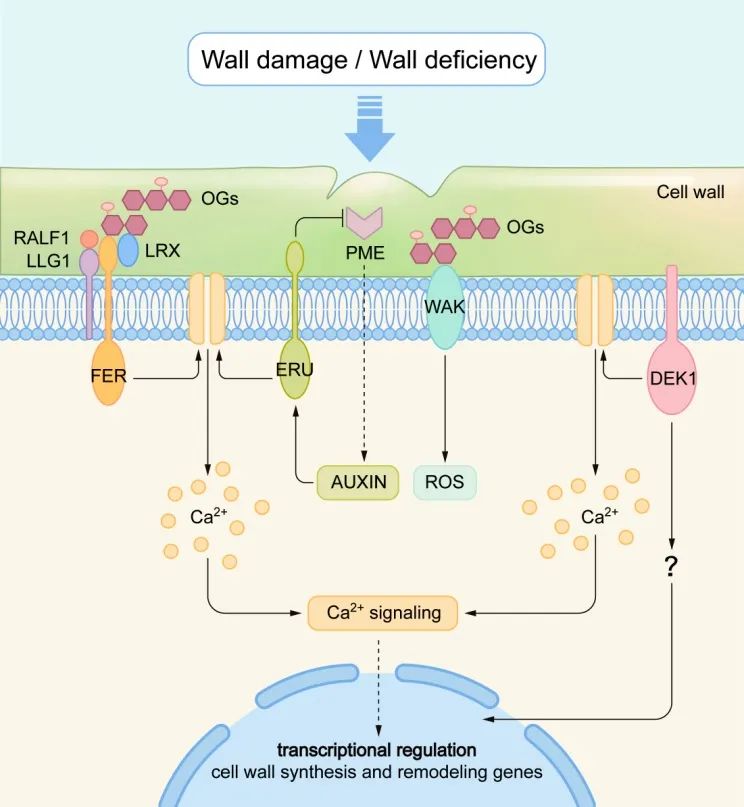 细胞壁完整性维持在植物生长发育、形态建成、逆境适应和病原菌防御中的重要作用受到了广泛的关注,越来越多的证据表明果胶HG可以作为监测细胞壁完整性的信号分子,被细胞膜上的特异受体识别,启动胞内的信号转导和响应机制 (图2)。