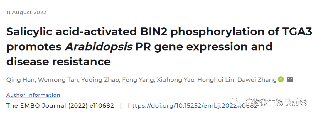 2022年8月11日,bat365在线中国官网登录入口张大伟教授团队在The EMBO Journal发表了题为“Salicylic acid-activated BIN2 phosphorylation of TGA3 promotes PR gene expression and disease resistance”的研究论文。该研究揭示了SA 信号如何通过类GSK3激酶BRASSINOSTEROID INSENSITIVE 2(BIN2)磷酸化TGA3激活植物免疫应答的过程,提出了BIN2整合BR信号与SA信号平衡植物生长与防御的新机制。