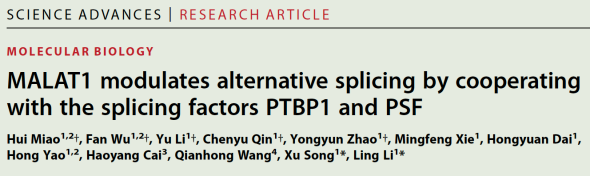 Science Advances:bat365在线中国官网登录入口李灵/宋旭团队揭示MALAT1与剪接因子PTBP1、PSF协同调节可变剪接并参与肝细胞癌的新机制