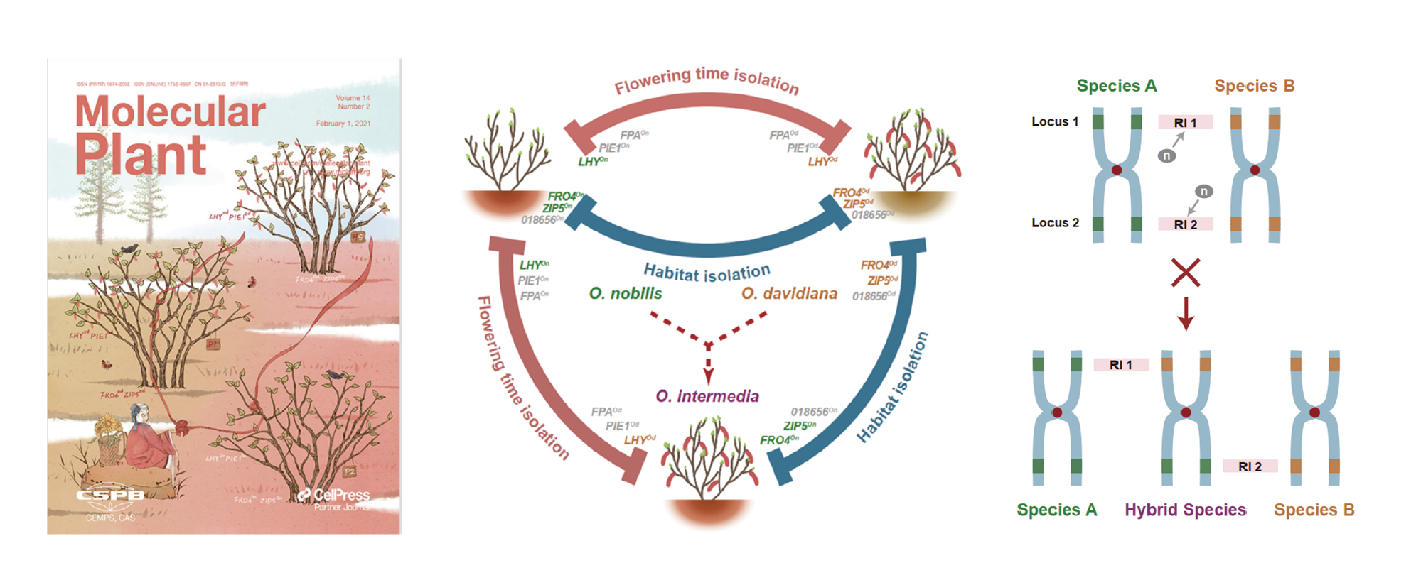 刘建全团队长期以青藏高原物种为研究对象(New Phytologist, 2022),围绕同倍性杂交物种形成这一科学问题开展研究,揭示了系列杂交物种形成案例(如Molecular Ecology, 2014, 2016, 2017, 2018, 2020, 2021; Botanical Journal of Biological Society, 2016等)。在对桦木科虎榛子属(Ostryopsis)长达12年的研究中(Molecular Plant, 2021),通过野外生殖隔离检测、基因组演化分析、关键物种形成基因鉴定、生化功能检验以及转基因验证等,揭示了居中虎榛子的同倍性杂交物种形成历史,建立了同倍性杂交物种形成分子遗传机制的新模型:杂交后代在杂交过程中交替继承来自两个亲本物种的生殖隔离相关基因,快速与两个亲本物种形成生殖隔离,并最终演化成为一个新物种(图3)。在此模型的基础之上,开发了杂交物种形成关键基因的鉴定方法,实现了杂交物种形成关键基因的精准定位。该方法克服了以往众多研究中,无法确定物种形成关键基因是否在物种群体间分化固定、及其是否驱动了物种起源的早期生殖隔离等技术难点;可对古老杂交物种形成事件(尤其是亲本已分化为多个现存物种的杂交物种形成事件)中的关键基因进行精准鉴定。