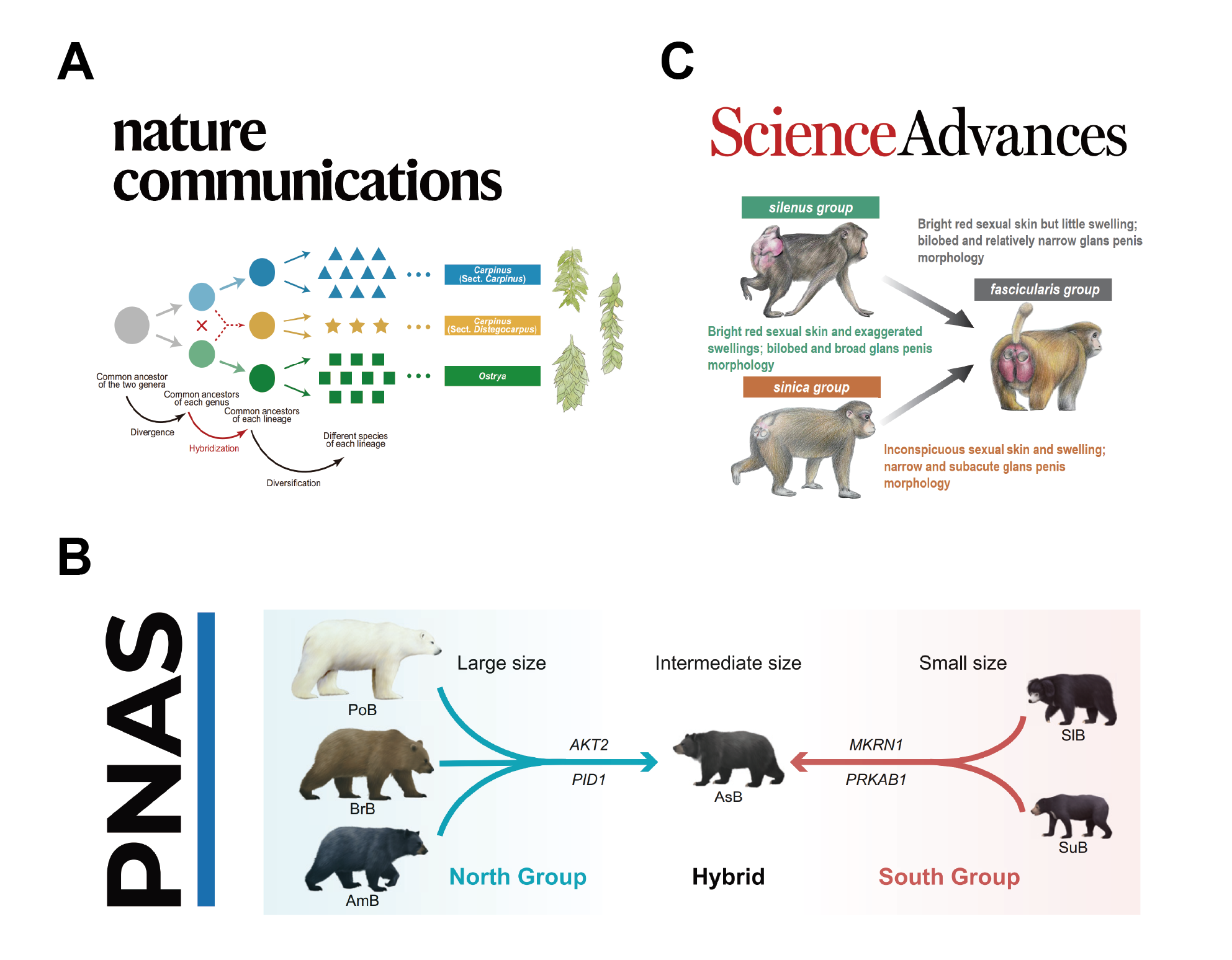 刘建全团队通过大数据统计发现同倍性杂交物种与亲本物种都存在强烈的生态位差异,表明生态位(包括地理)隔离对于杂交物种的起源具有重要作用(American Naturalist, 2022)。值得一提的是,应用上述研究中(Molecular Plant, 2021)开发的新模型与新方法,刘建全团队独立、或与合作者们(共同一作和共同通讯)在动植物类群中相继发现了多个存在于高级分类单元间(属间或组间)的古老同倍性杂交物种形成事件,并对其过程中的物种形成关键基因进行了鉴定与分子功能验证(图4A: 桦木科鹅耳枥属千金榆组, Nature Communications, 2022; 图4B: 亚洲黑熊, PNAS, 2022; 图4C: 猕猴属食蟹猴组, Science Advances, 2023,共同一作),证实了同倍性杂交物种形成同样存在于非人灵长类类群中(Science, 2023; Science Advances, 2023)。这些研究标志着刘建全团队提出的同倍性杂交物种形成分子遗传机制的新模型和鉴定杂交物种形成关键基因的新方法在众多类群中具备较强的普适性;其对古老杂交物种形成事件的识别,和对杂交物种起源过程中关键基因的鉴定,展现出较强的技术优越性。