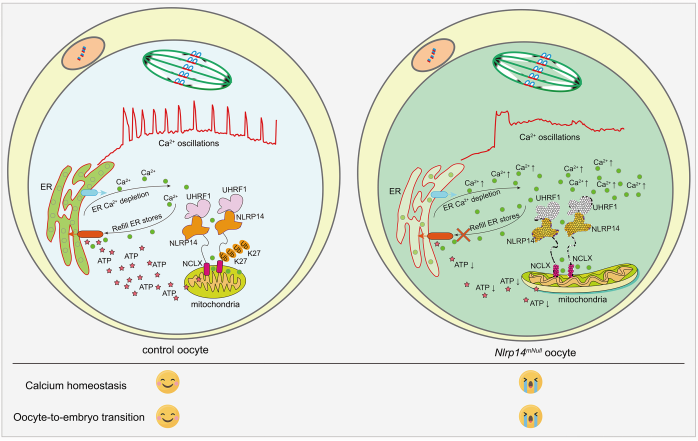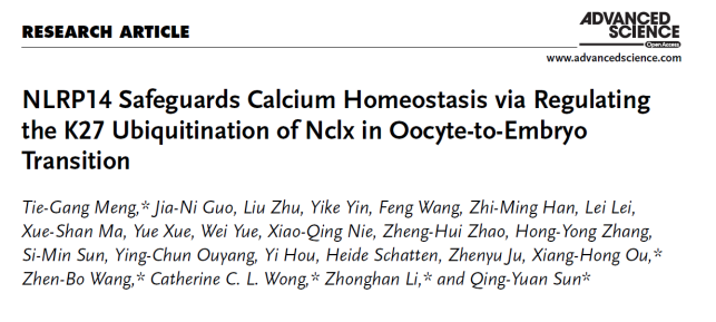 近日,bat365在线中国官网登录入口李中瀚团队与广东省第二人民医院生殖医学中心的孙青原/欧湘红/孟铁刚团队、北京协和医院黄超兰团队和中国科学院动物研究所王震波团队联合在Advanced Science在线发表了题为“NLRP14 safeguards calcium homeostasis via regulating the K27 ubiquitination of NCLX in oocyte-to-embryo transition”的最新研究成果,首次系统性揭示了胞质定位的母源因子NLRP14与UHRF1协同调控卵子钙稳态和早期胚胎发育,并鉴定出下游调控的唯一关键钙离子通道NCLX(也称为 Slc8b1),为解析母源因子在早期发育中的功能和机制提供了新范式。