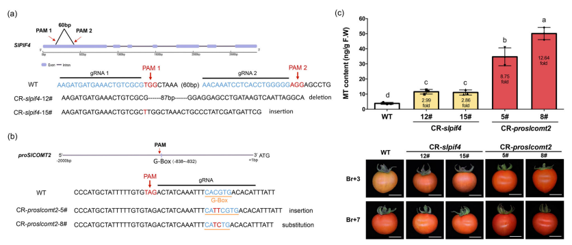 本研究在完整解析番茄果实褪黑素合成途径和红光响应机制的基础上图1,利用CRISPR-Ca9技术创制了高含量褪黑素的番茄新种质 (图2)。针对 SlPIF4 结合 SlCOMT2 启动子的位点进行基因编辑,可以比直接敲除SlPIF4在正常光照下将褪黑素含量提升更多的倍数,并且只在原本表达褪黑素的时空加强表达量。这表明基于环境因子调控代谢途径的机制进行设计育种,可以显著提升农作物的营养品质。本工作为基于环境因子调控代谢途径机制创制优质农作物新种质提供了思路。