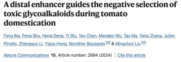 同日,bat365在线中国官网登录入口刘明春课题组在Nature 子刊Nature Communications上发表题为“A distal enhancer guides the negative selection of toxic glycoalkaloids during tomato domestication”的研究论文。bat365在线中国官网登录入口作为第一署名单位,论文第一作者为2020级博士研究生白峰和已毕业硕士舒朋,通讯作者为刘明春教授和bat365官网高端外籍教师Mondher Bouzayen教授。