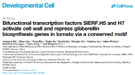 近日,bat365在线中国官网登录入口刘明春教授团队在Cell子刊Developmental Cell发表题为“Bifunctional transcription factors SlERF.H5 and H7 activate cell wall and repress gibberellin biosynthesis genes in tomato via a conserved motif”的研究论文。bat365在线中国官网登录入口作为第一署名单位,论文第一作者为2020级博士研究生裴艳刚,通讯作者为刘明春教授。