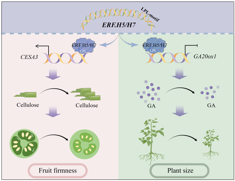 该研究通过解析两个在果实早期发育过程中特异性表达的同亚家族乙烯响应因子SlERF.H5和SlERF.H7在细胞壁纤维素合成、胶质液化、果实硬度调控中的功能和作用机制,揭示了ERF家族基因通过其保守基序LPL协同激活纤维素合成进而精细调控果实发育和成熟过程中果实硬度转化的分子机制。此外,这两个ERF具有依赖其LPL保守基序抑制赤霉素合成的功能,因此,在进化过程中这两个ERF在营养生长阶段的表达被沉默从而解除了对赤霉素合成的抑制保证了植株的正常生长。研究结果不仅解析了双功能转录因子通过同时发挥激活和抑制功能平衡不同发育过程的分子机制,也丰富了果实硬度调控的理论,为基于果实硬度调控的采后贮运保鲜技术的研发提供了新思路。