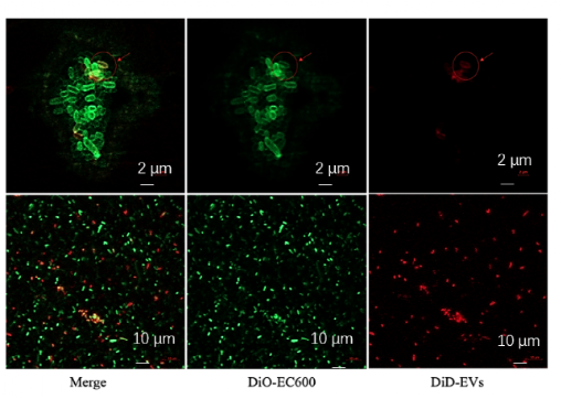 EVs 与受体菌 EC600 发生融合。其中EC600被DiO染料染成绿色,EVs被DiD染料染成红色