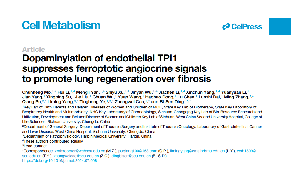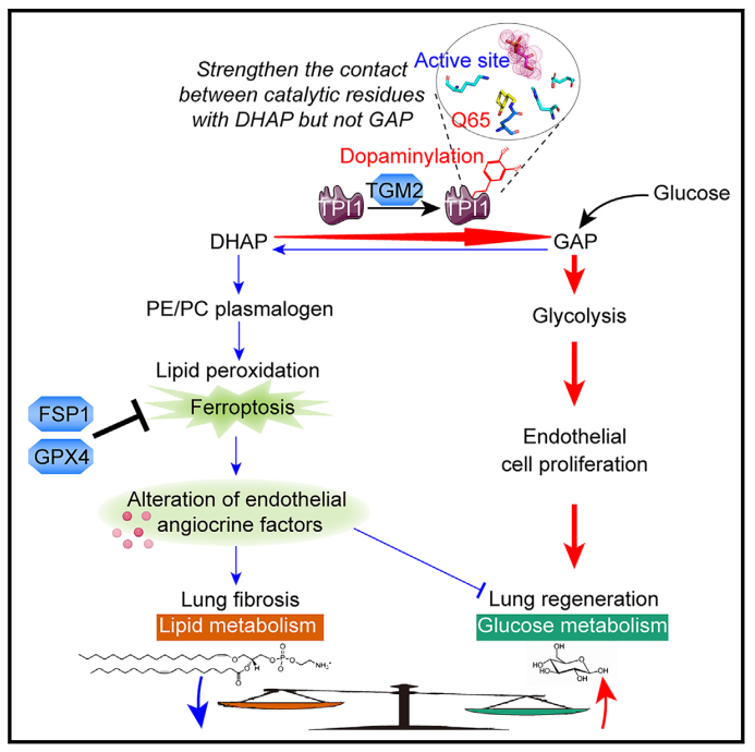 丁楅森团队以往工作发现血管内皮细胞通过旁分泌Angiocrine因子与邻近的上皮、间质及血液细胞互作从而调控肺的再生和纤维化(文献1-6)。近日,bat365在线中国官网登录入口丁楅森团队在Cell Metabolism发表题为“Dopaminylation of endothelial TPI1 suppresses ferroptotic angiocrine signals to promote lung regeneration over fibrosis”的研究论文。该研究通过整合点击化学、蛋白组学、结构生物学、基因敲除/敲入鼠、临床分析等多学科手段,发现多巴胺通过修饰肺血管TPI1调控Angiocrine因子,抑制铁死亡从而促进肺再生并抑制纤维化。