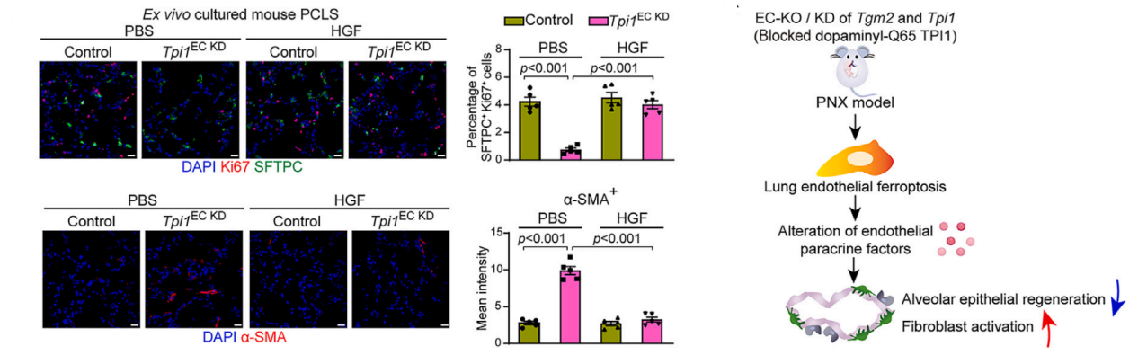 血管内皮细胞通过旁分泌Angiocrine因子形成“引导性血管微环境”,调控肺再生和纤维化。利用肺再生模型和肺组织精细切片(PCLS),发现在再生肺内皮细胞中阻断TPI1多巴胺化会诱发铁死亡,重编程血管微环境旁分泌因子信号。这种受损的血管内皮旁分泌功能促进了成纤维细胞的活化,并减少了肺泡上皮细胞的再生。