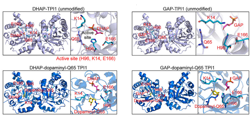 TPI1是一种代谢酶,可以催化醚磷脂合成前体DHAP与葡萄糖关键代谢物GAP之间的相互转化。作者们进一步通过质谱分析,发现TPI1多巴胺化修饰发生在其Q65氨基酸位点。通过蛋白结构分析,TPI1 Q65位点的多巴胺化修饰增强了其催化残基与DHAP之间的接触,引导酶促反应朝着将DHAP转化为GAP的方向进行。