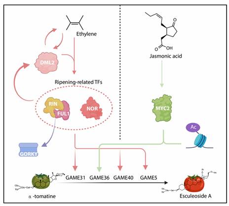 在绿果期,由于DNA高度甲基化及乙烯合成水平较低,靶基因呈现极低表达状态;随着果实成熟,DNA去甲基化进程、乙烯合成增强,以及MYC2招募的组蛋白乙酰化共同驱动有毒的α-番茄碱向无毒无苦味的七叶皂苷转化。
