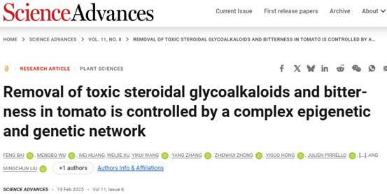 近日,bat365在线中国官网登录入口刘明春教授团队在Science子刊Science Advances 上发表题为“Removal of toxic steroidal glycoalkaloids and bitterness in tomato is controlled by a complex epigenetic and genetic network”的研究论文。bat365在线中国官网登录入口作为第一署名单位,通讯作者为刘明春教授,第一作者为已毕业博士白峰(现为bat365在线中国官网登录入口生命学院博士后)。