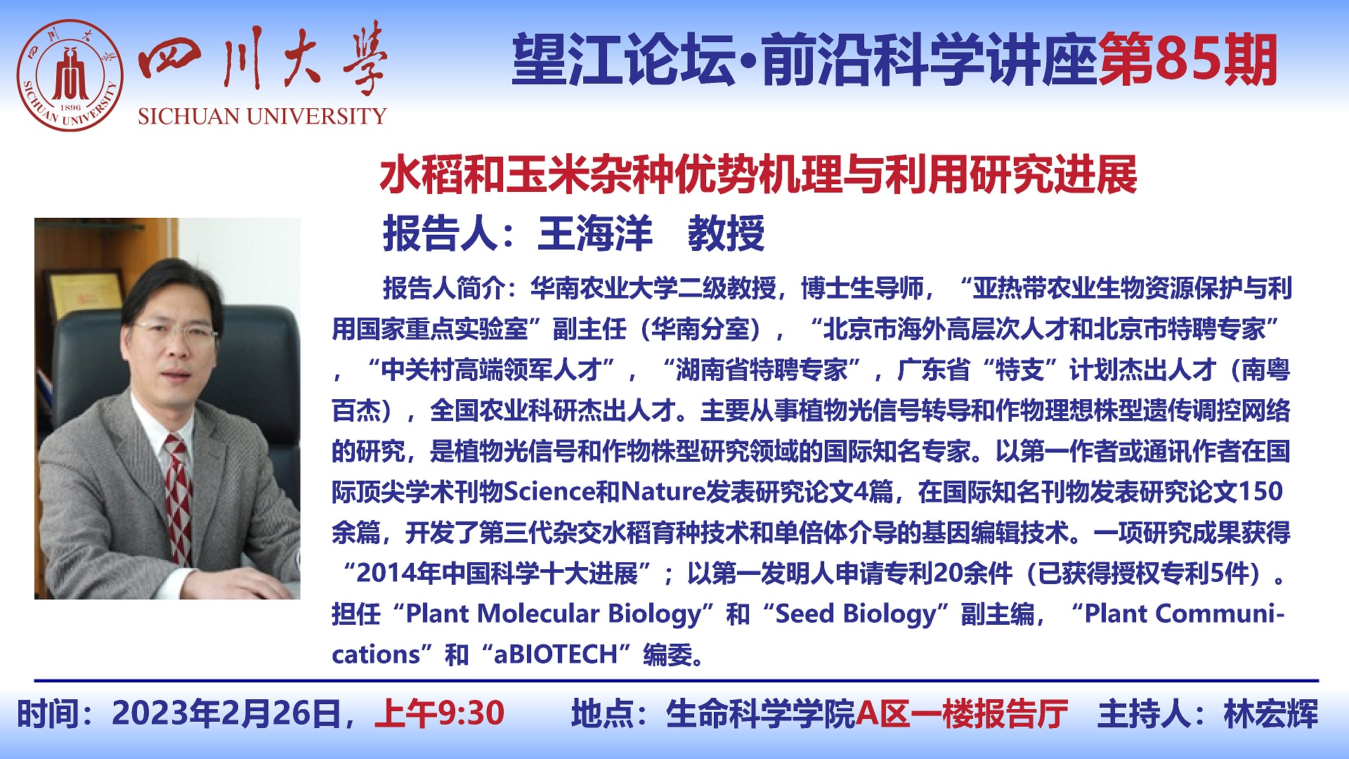 望江论坛-前沿科学讲座(第85期):王海洋教授2月26日学术报告