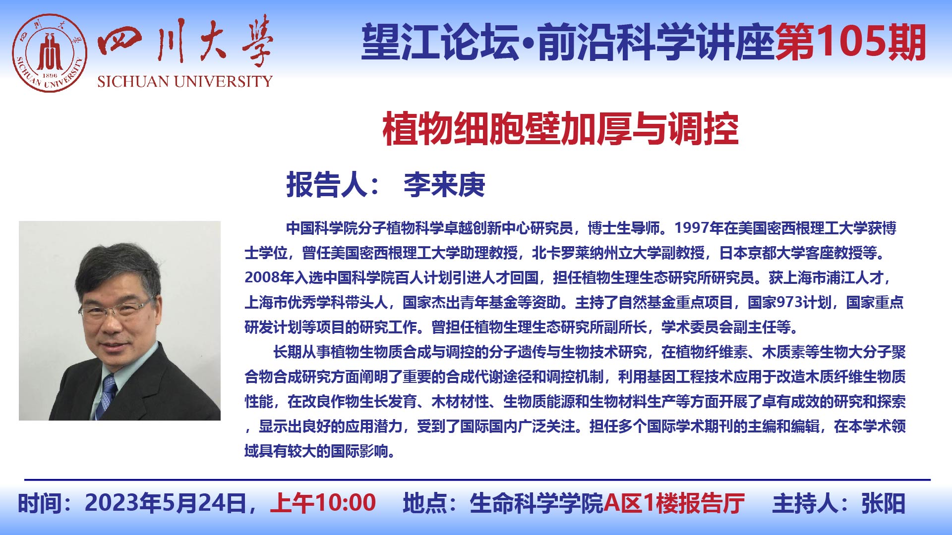 望江论坛-前沿科学讲座(第105期):李来庚教授5月24日学术报告