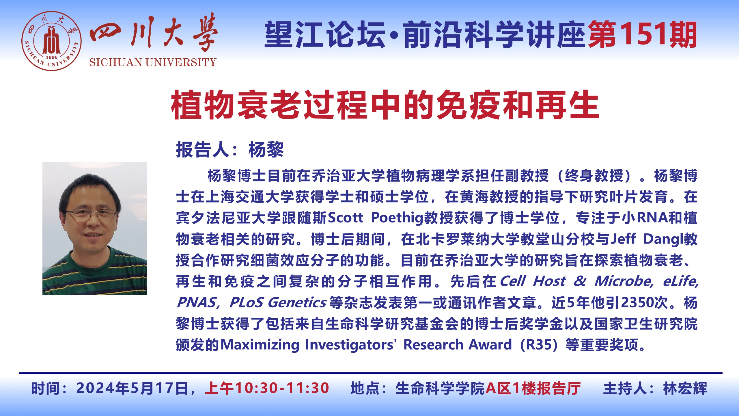 望江论坛-前沿科学讲座(第151期):杨黎教授5月17日学术讲座