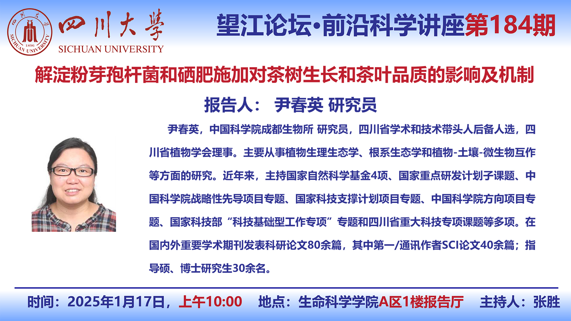 望江论坛-前沿科学讲座(第184期):尹春英研究员1月17日学术讲座