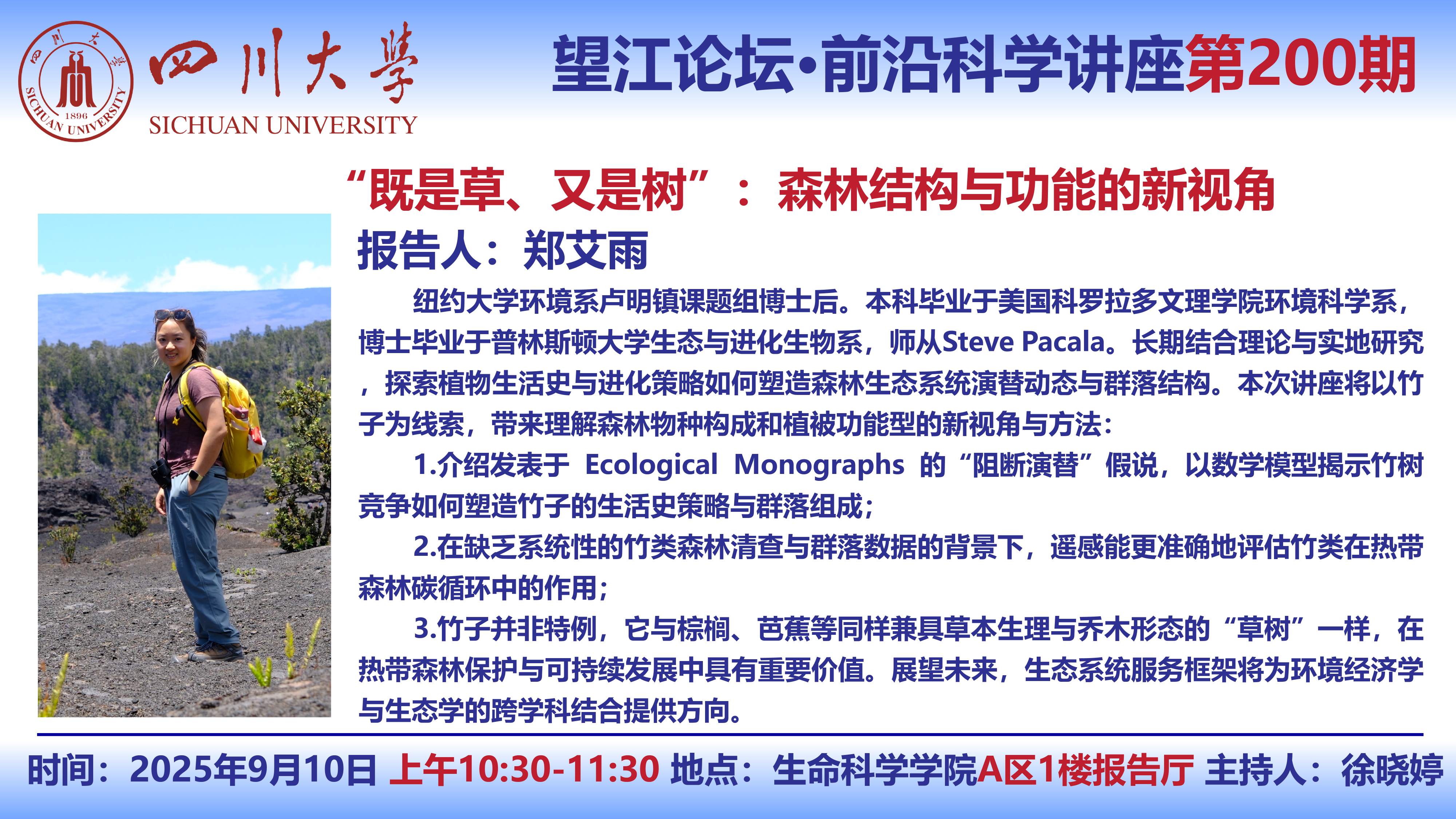 望江论坛-前沿科学讲座(第200期):郑艾雨博士9月10日学术讲座