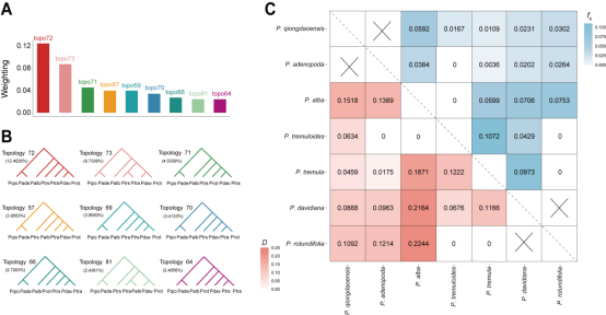 最后,研究人员利用不同方法检测和评估了物种间基因组渐渗程度大小。结果显示种间亲缘关系在基因组不同区域存在着不同权重的拓扑结构(图4A-B),通过D检验和f4检验分析,证明了基因渐渗在杨属不同物种分化过程中广泛存在(图4C)。