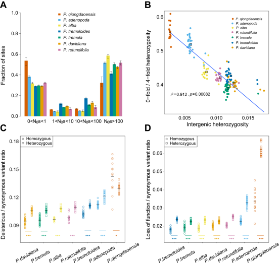 种间杂交与渐渗在自然界中广泛存在,并对物种形成和进化历史有很大的影响。然而,杂交渐渗如何与不同遗传和进化因素相互作用进而影响物种适应性分化和基因组进化的机制尚不明确。近期,bat365在线中国官网登录入口王婧教授课题组在Molecular Biology and Evolution杂志上发表题为Demographic history and natural selection shape patterns of deleterious mutation load and barriers to introgression across Populus genome的研究论文,通过对杨属(Populus)白杨组七个物种227个个体的全基因组重测序数据分析研究,发现物种分化历史、遗传重组速率、不同物种对有害突变的净化选择效率以及适应性渐渗等遗传和进化因素均不同程度影响基因组杂交渐渗信号的保留,对杂交后基因组进化发挥着重要作用。