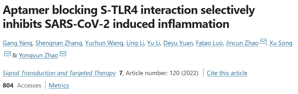 近日,bat365在线中国官网登录入口宋旭教授/赵永云课题组在国际权威期刊Signal Transduction and Targeted Therapy(IF=18.187)发表题为Aptamer Blocking S-TLR4 Interaction Selectively Inhibits SARS-CoV-2 Induced Inflammation的文章,筛选和鉴定了可抑制SARS-CoV-2诱发的炎症的核酸适配体,该核酸适配体通过特异性阻断Spike蛋白与TLR4受体相互作用,高选择性地抑制SARS-CoV-2病毒所诱发的炎症。