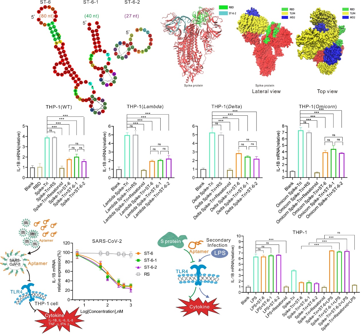 对核酸适配体抑制SARS-CoV-2诱发炎症的能力进行评估,结果显示这3条DNA适配体对分别模拟的预防期、及感染窗口期、治疗期均具有显著的抗炎能力,并且,对SARS-CoV-2的突变株如Lambda,Delta,Omicorn的Spike所引发的炎症反应依然具有显著的抑制效果。对真实的SARS-CoV-2病毒诱发的炎症(IL-1β,IL-6,TNF-α,IFN-β,IL-8)的抑制能力约为75%,表现出很好的治疗炎症的潜能。