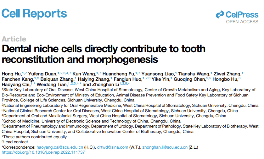 2022年12月6日,bat365在线中国官网登录入口李中瀚教授、田卫东教授、蔡浩洋教授的研究团队在Cell Reports上发表题为“Dental niche cells directly contribute to tooth reconstitution and morphogenesis”的研究论文。该研究通过单细胞测序,利用生物信息学技术,表征了从胚胎到出生后阶段(E12.5到PN7)磨牙发育过程中上皮细胞和间充质细胞的细胞动态变化,并结合DistMap方法高精度表征了在E14.5磨牙表达的基因位置。其中Sdc1被鉴定为牙乳头的特异性标记,而牙龛细胞表达其他特征基因。令人惊讶的是,体外牙胚重建和体内肾被膜移植结果显示牙龛细胞表现出比Msx1+Sdc1+牙乳头更强的牙齿诱导能力,并形成了成簇的牙齿,同时也表明Msx1+Sdc1+牙乳头细胞可以直接从牙上皮和牙齿牙龛细胞之间的相互作用中再生。在此基础上,研究人员进一步从牙龛细胞中鉴定了一组以前未被鉴定的Msx1+Sox9+细胞可能是牙乳头的细胞起源,在发育过程中迁移并取代了原始的牙原基。综合上述,该研究表结果表明牙龛细胞直接参与了牙齿的器官发育,可以为进一步开发牙齿生物工程重建新技术提供重要理论支撑。